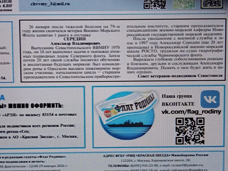 Получил печальную информацию о том, что 26 января 2026 г. на 79-м году жизни после тяжелой и продолжительной болезни скончался капитан 1 ранга в отставке Середин Александр Владимирович.